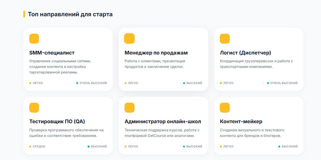 Отдельного внимания заслуживает рост профессий с быстрым входом, где не требуется профильное высшее образование. Короткие курсы, модульное обучение и онлайн-платформы позволяют за 1–3 месяца получить базовую квалификацию и выйти на рынок труда — сначала на начальные позиции, стажировки или проектную занятость, с возможностью дальнейшего роста и закрепления в профессии. Это особенно актуально для взрослых специалистов, которые хотят повысить доход, сменить сферу деятельности или перейти на более гибкий формат занятости.